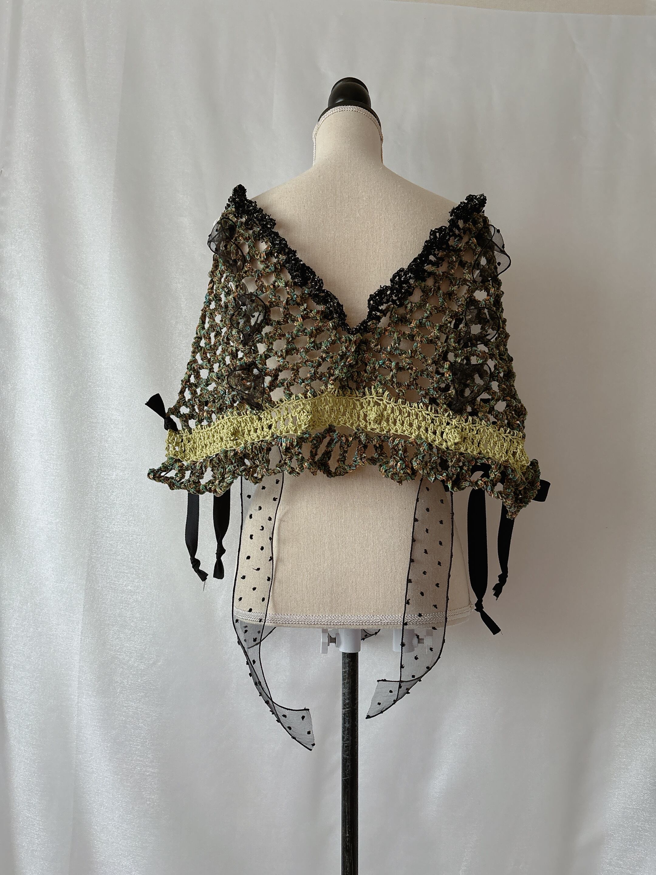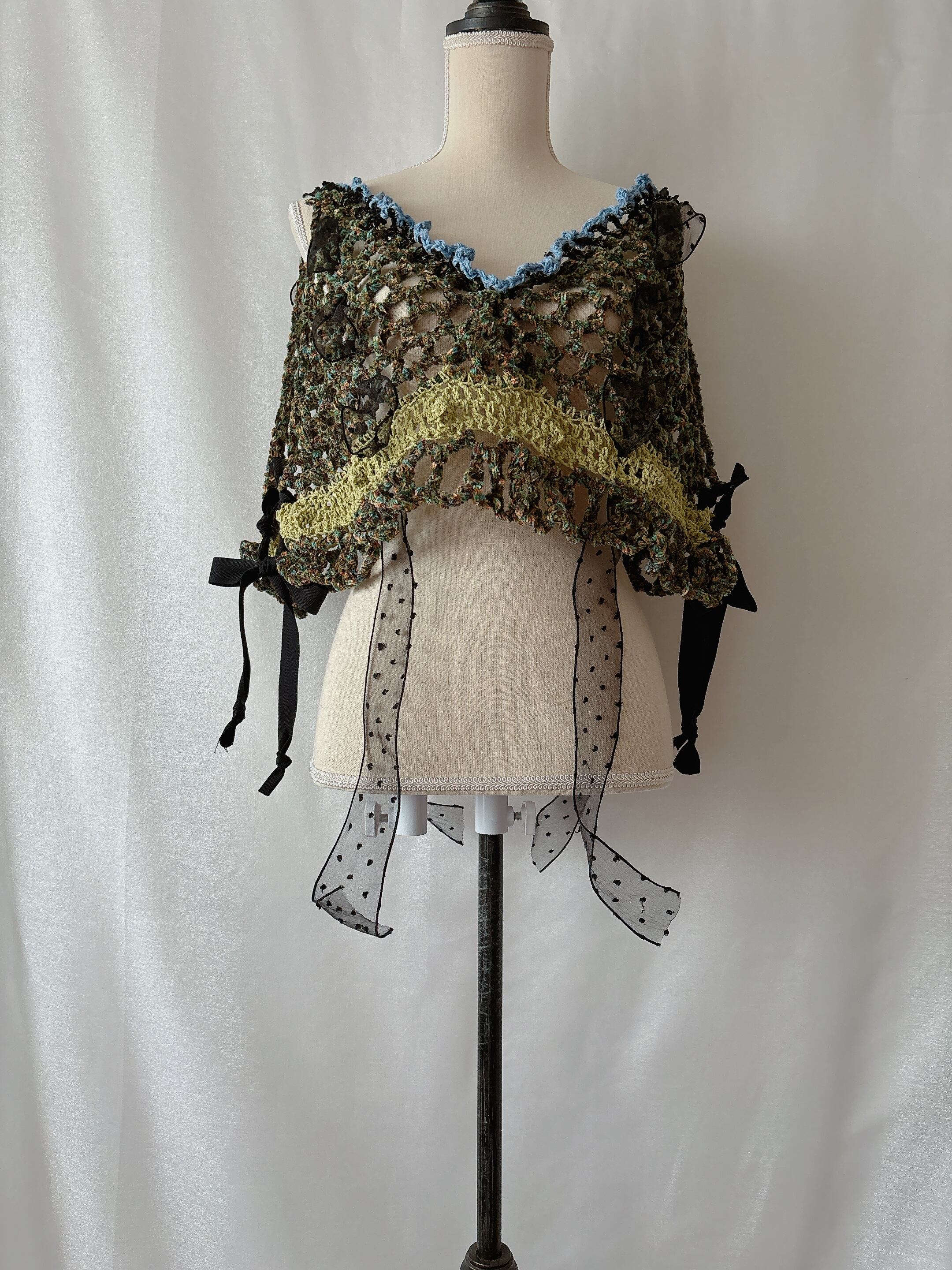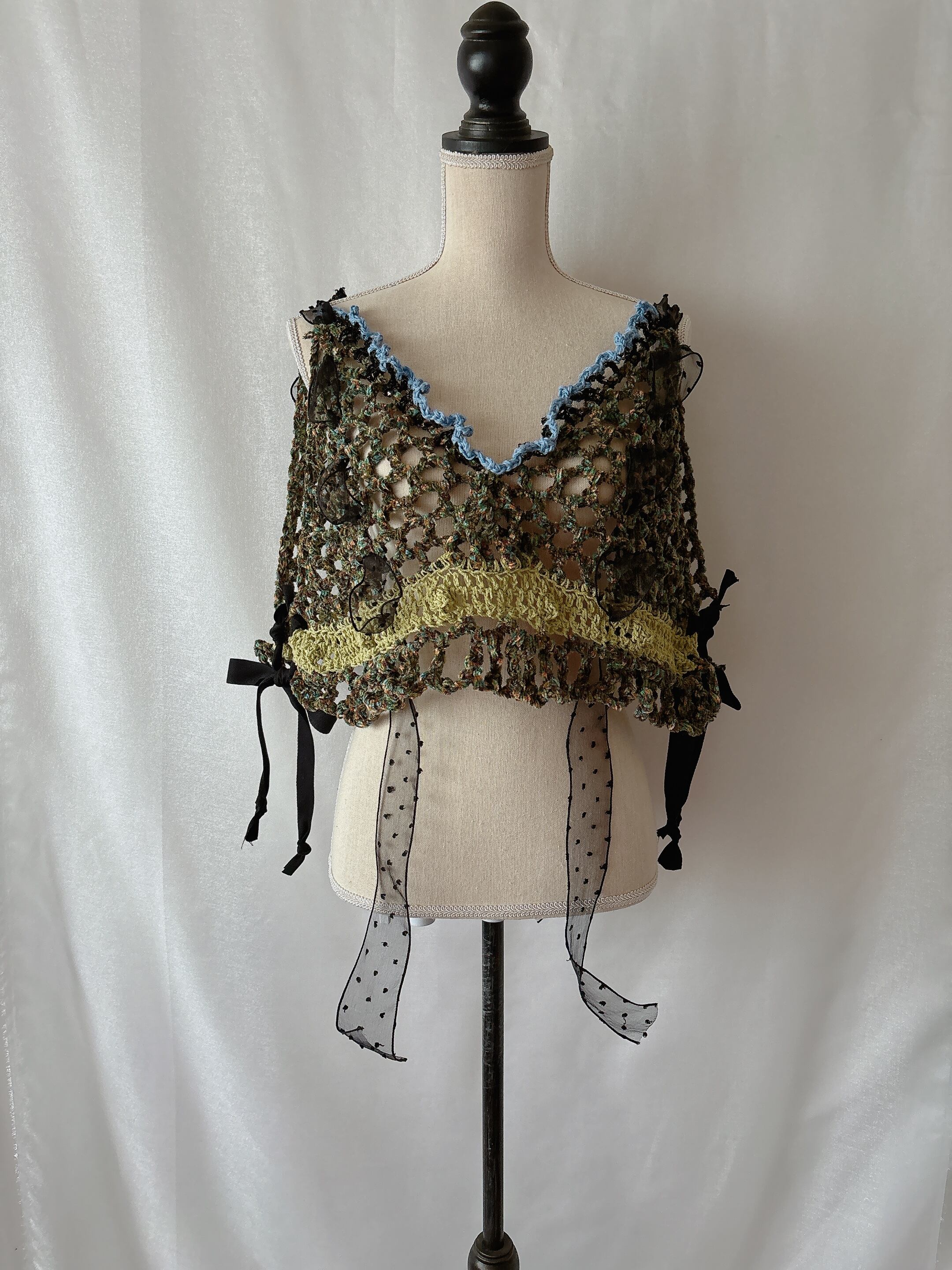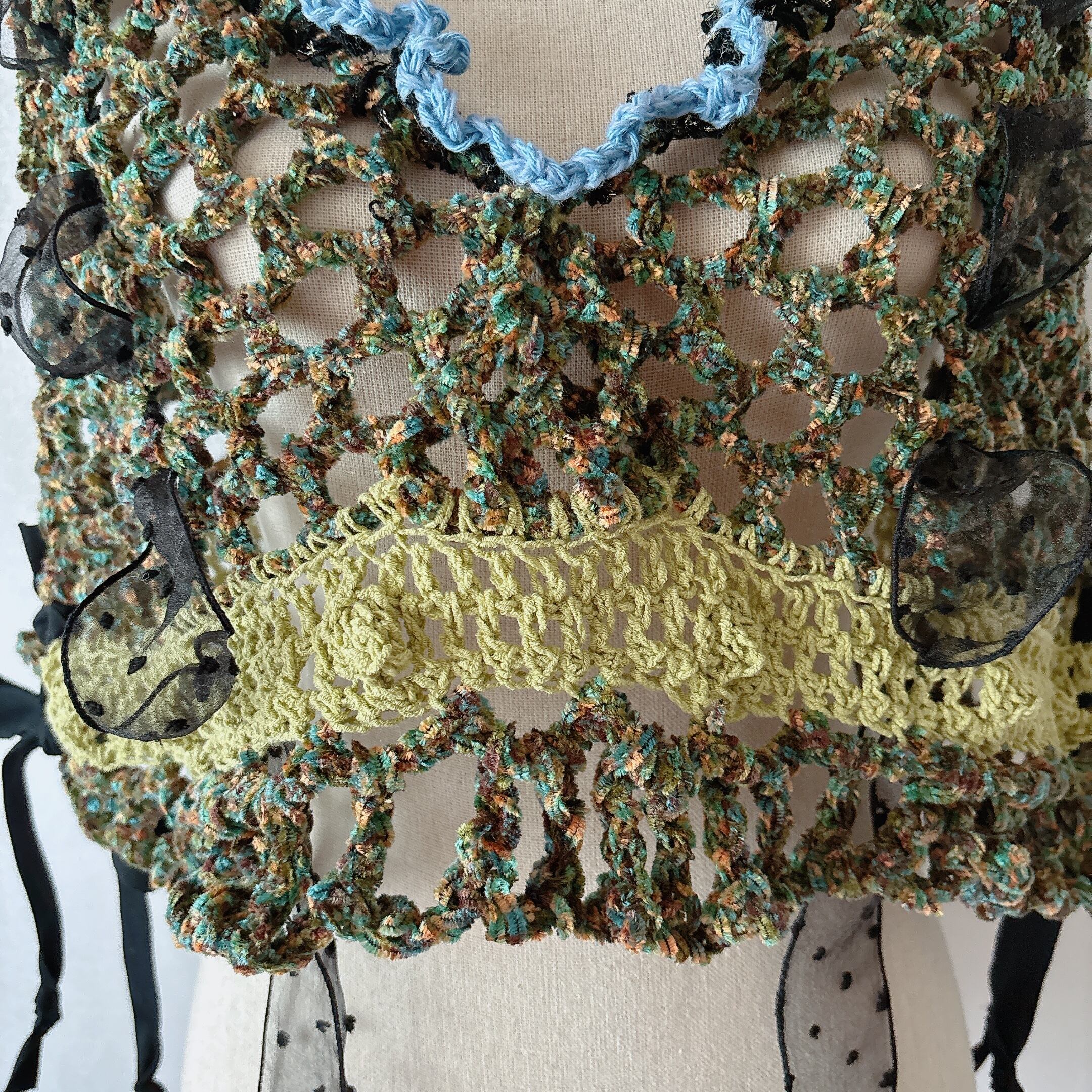 緑やオレンジ、青、黒など色んなカラーが調和した美しいビスチェです。